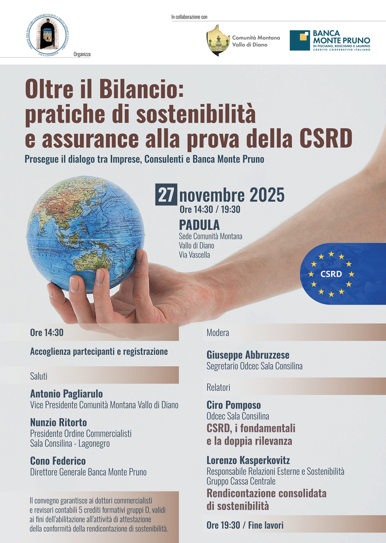 Il 27 novembre 2025, dalle 14:30 alle 19:30, presso la nuova Sede della Comunità Montana Vallo di Diano a Padula (Via Vascella), è in programma il convegno: “Oltre il Bilancio: pratiche di sostenibilità e assurance alla prova della CSRD”