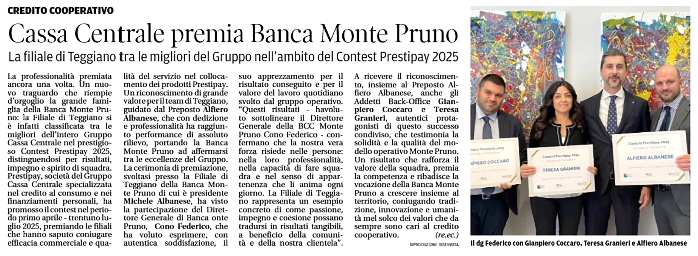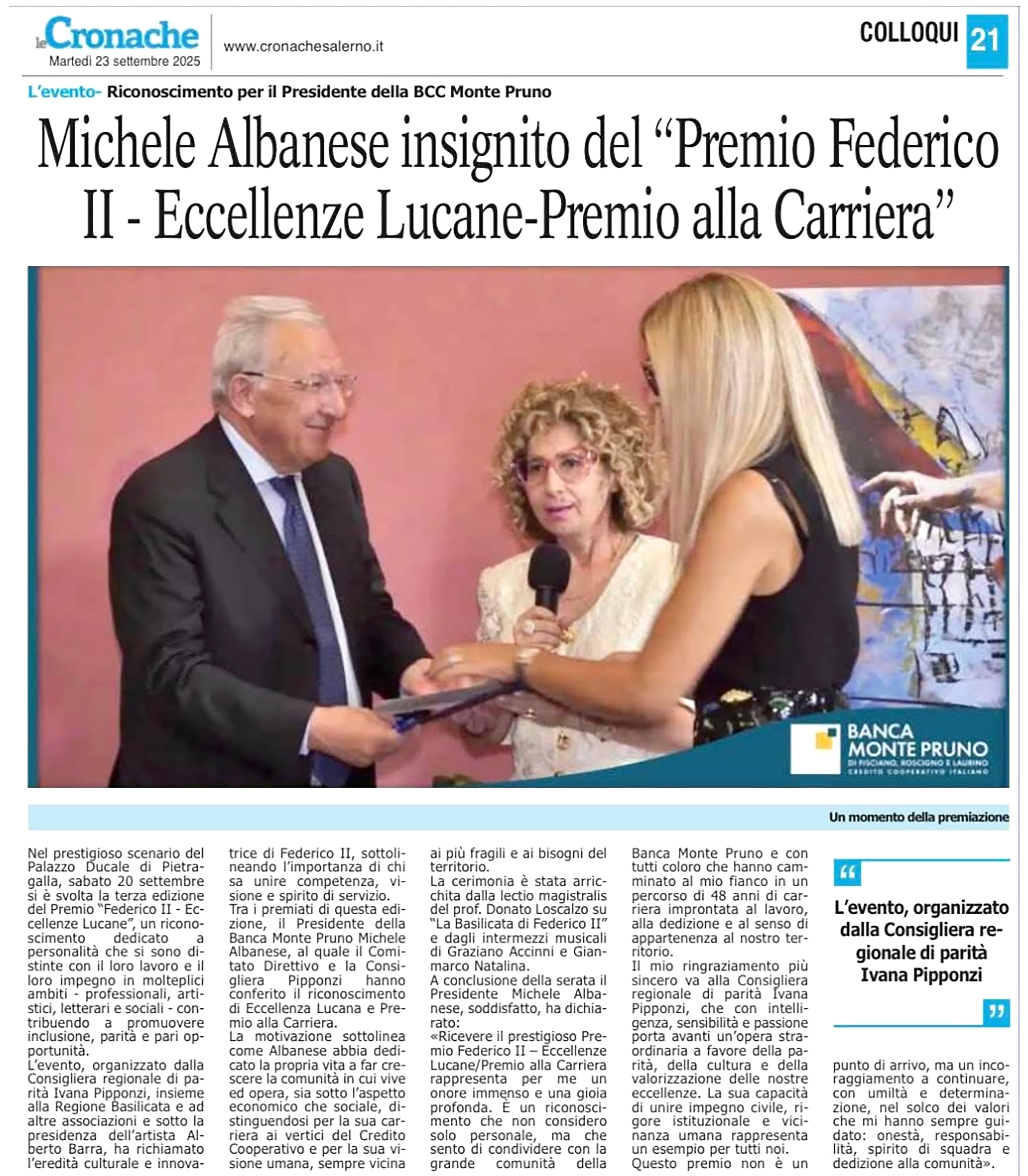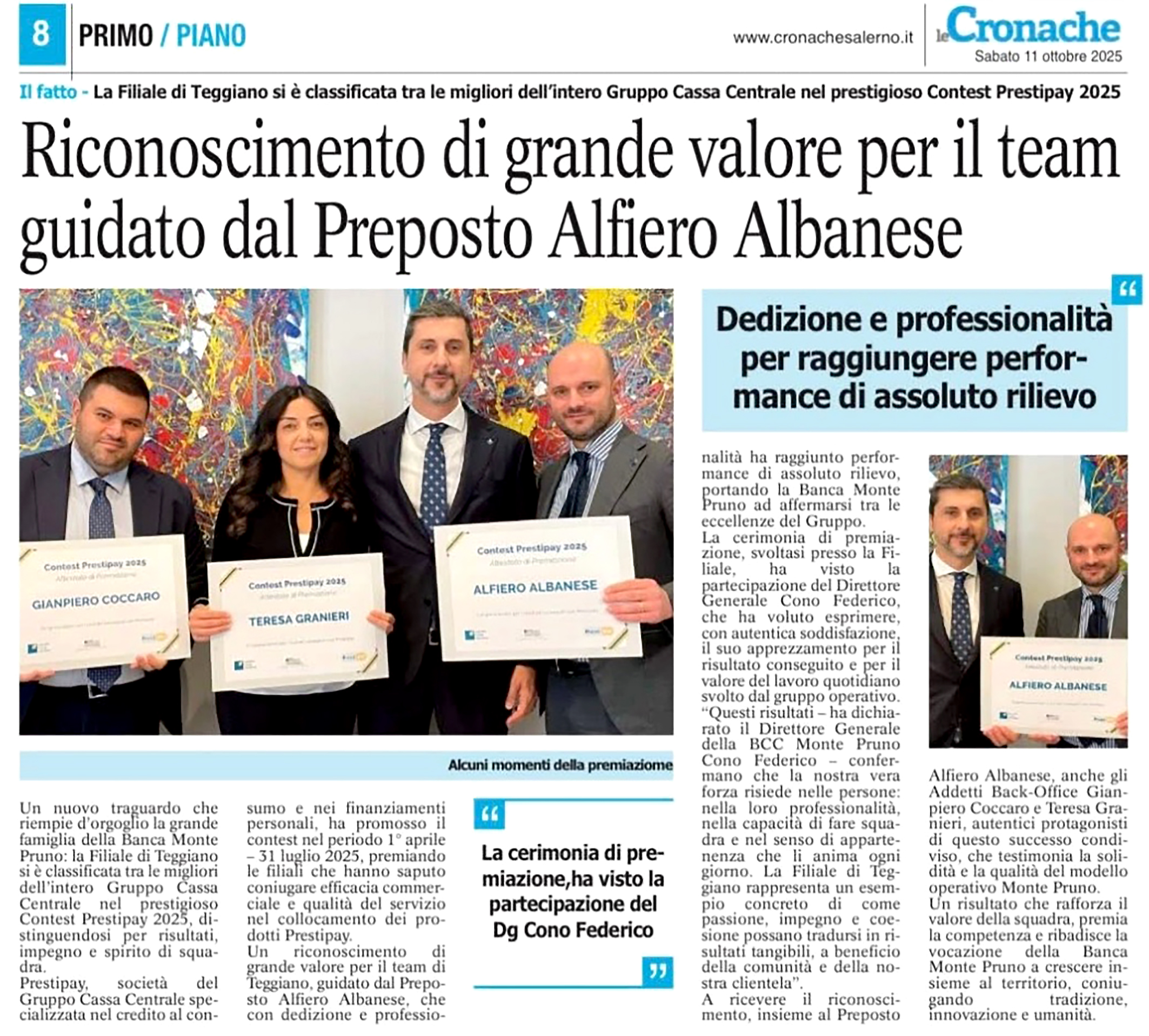 CRONACHE LUCANE - BEST BANKS ITALIA ALLA BANCA MONTE PRUNO: RICONOSCIMENTO "ECCELLENZE REGIONALI CAMPANIA - Soddisfazione del Dg Albanese: "Si tratta di un premio che certifica ulteriormente l’operato e l’azione della Banca a servizio del territorio"