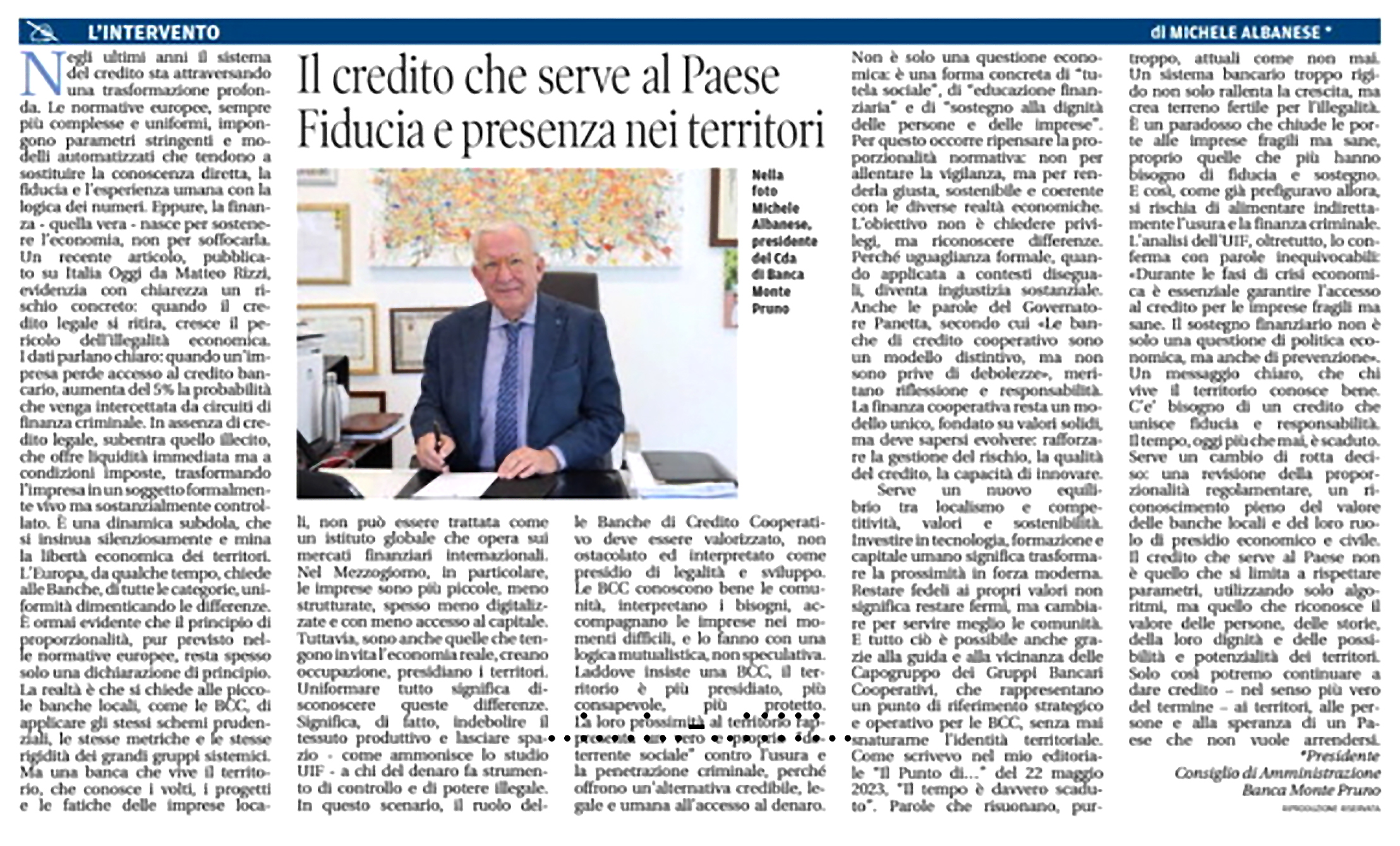 LA CITTÀ - "LE BANCHE DEVONO MUTARE LA MENTALITÀ" - Michele Albanese, dg di Banca Monte Pruno: "Bisogna avere più rispetto delle persone"