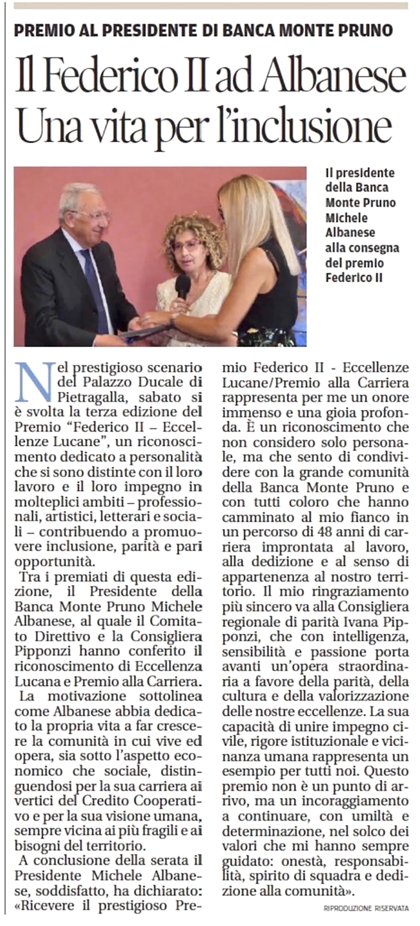 CRONACHE LUCANE - LA BANCA MONTE PRUNO PREMIATA AL BEST BANKS DI MILANO FINANZA - Il Direttore Generale Albanese: "Ricevere un attestato così importante ripaga i grandi sacrifici che abbiamo compiuto in tantissimi anni di storia"