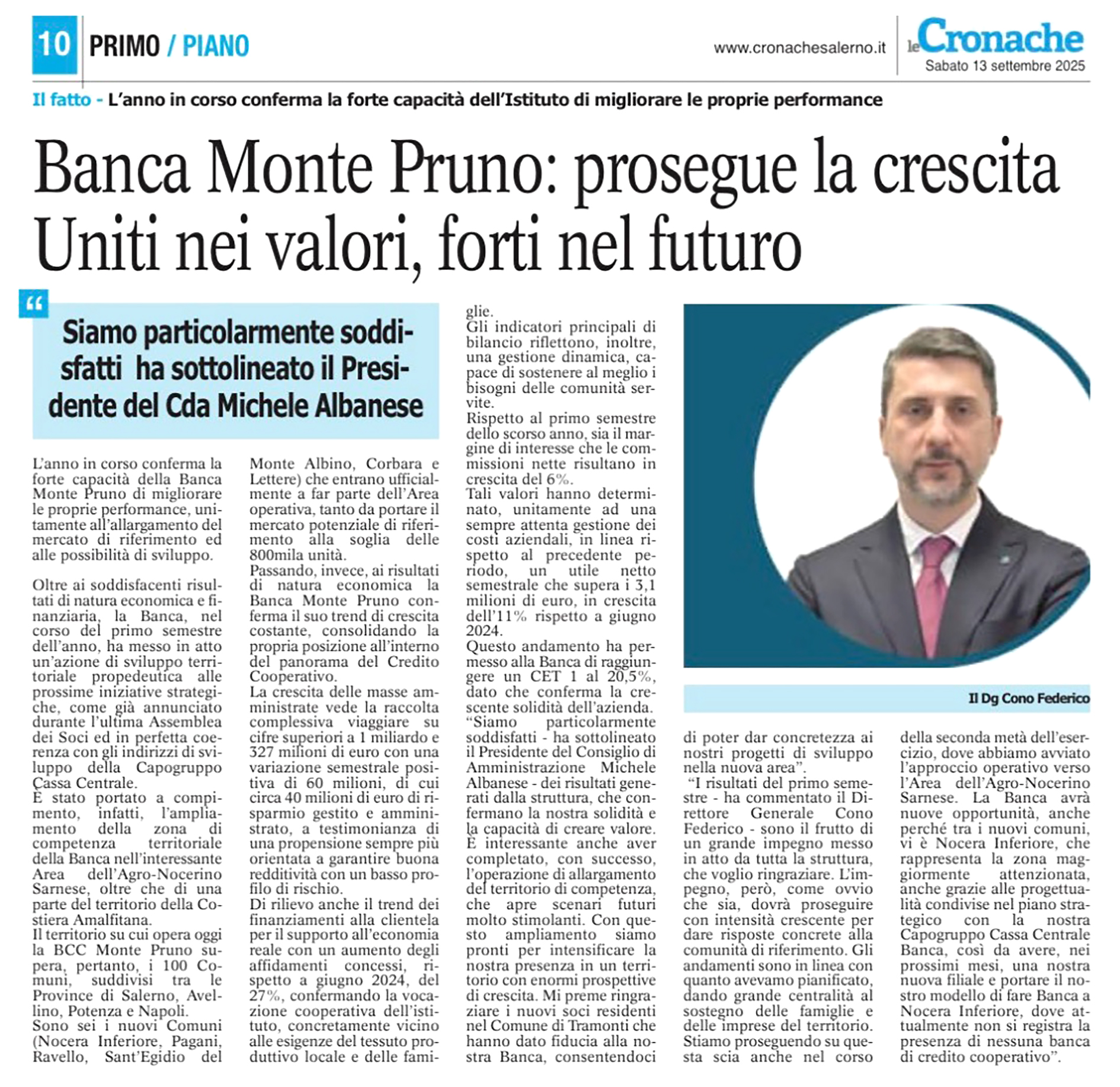 LE CRONACHE - BANCA MONTE PRUNO: IL CDA NOMINA CINIELLO VICE PRESIDENTE - Una nomina che conferma l’ottimo lavoro svolto negli anni con grande impegno e dedizione